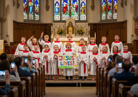 A group of children in white and red choir robes standing on a stage in a church, holding a 'Jesus Lives!' sign and singing with mouths open, while audience members in pews record them with their phones, capturing a joyful and uplifting moment of youthful devotion and musical expression.