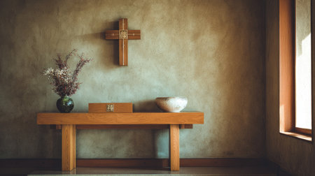 This serene interior features a wooden cross and minimalist decor, creating a calm and inviting spiritual space perfect for contemplation and reflection.