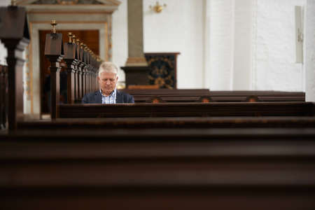 He spends a lot of time in church. A senior man sitting in the pews at his local church.