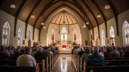 A congregation of people is seated in a tranquil church, attentively participating in a Sunday service under dim lighting, surrounded by beautiful stained glass.
