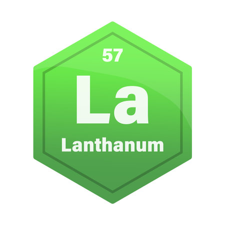 Lanthanum chemical element tile. Atomic number 57. La chemical sign. Vivid green Vector hexagon. EPS 10.