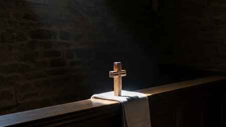 Simple Wooden Cross on Altar with Candle in Sunlit Church Interior. Concept of Spiritual Reflection, Religious Heritage. Ash Wednesday.