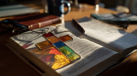 Concept photo of a cross made of stained glass, suspended above a study desk with a Bible and a journal filled with reflections. The vibrant colors of the cross remind us to see th