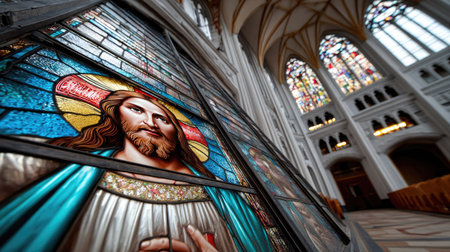 This stunning image features a vibrant stained glass window depicting Jesus Christ, set in an architectural gem of a church. The intricate details and bright colors create a profound atmosphere of spirituality and reverence, inviting contemplation and reflection.