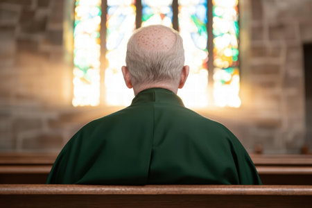 senior man in green robe praying in church