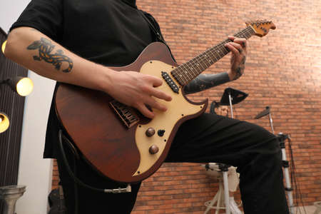 Man playing electric guitar during rehearsal in studio, closeup. Music band practice