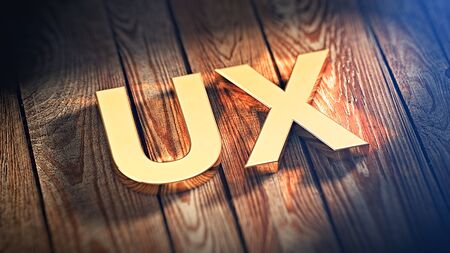 Acronym UX is lined with gold letters on wooden planks. 3D illustration image