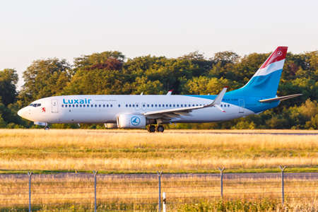 Findel, Luxembourg - June 24, 2020: Luxair Boeing 737-800 airplane at Findel Airport (LUX) in Luxembourg. Boeing is an American aircraft manufacturer headquartered in Chicago.