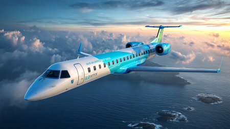 Stunning image of a commercial airplane flying high in the sky, showcasing the beauty of aviation and the thrill of travel with a captivating perspective and vibrant lighting.