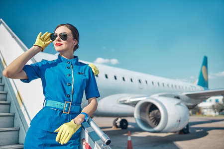 Jolly beautiful stewardess enjoying working day in airport