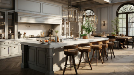 A Kitchen With A Center Island Surrounded By Stools. Generative AI