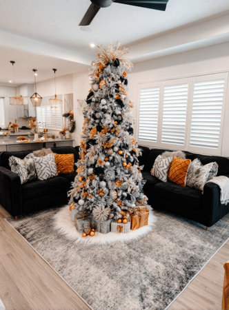A tall Christmas tree, adorned with ornaments, stands between two black couches in a well-lit living room. The room displays a neutral color palette, complemented by orange accents on the pillows. The scene suggests a festive and welcoming interior, suitable for various holiday-themed projects or editorial content.