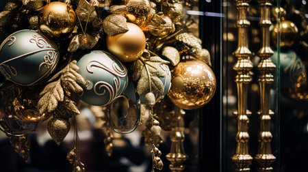 Stylish christmas silver and gold baubles and fir branches on building exterior. Modern christmas decor in city street. Winter holidays in Europe. Merry Christmas