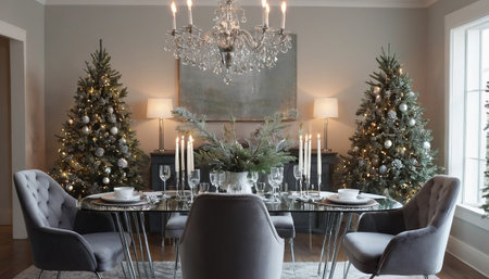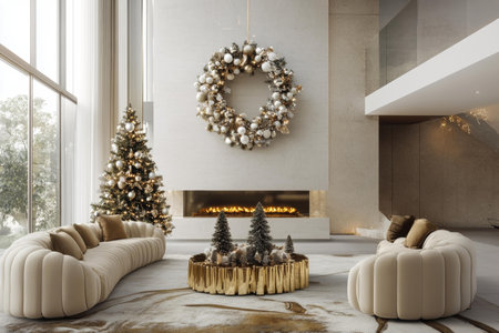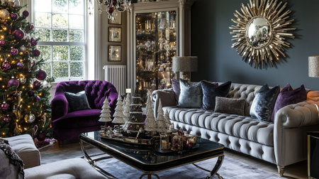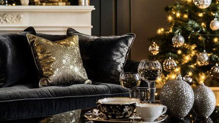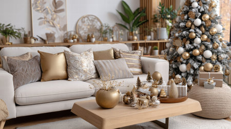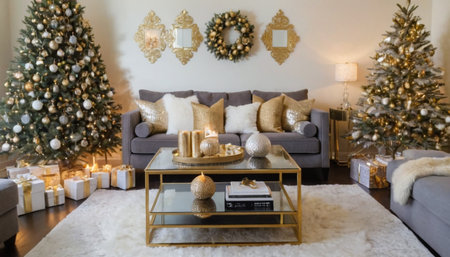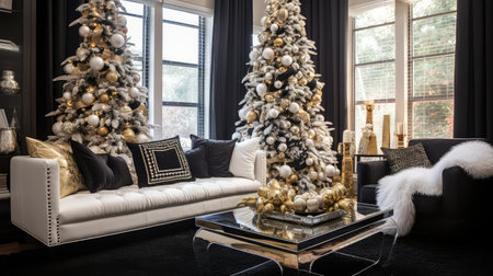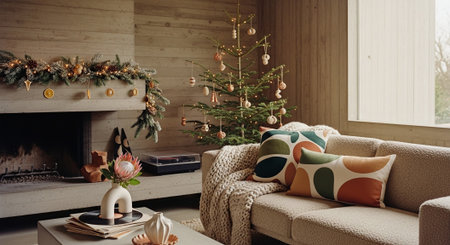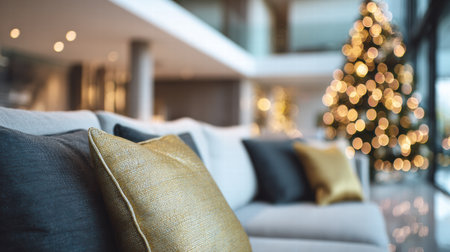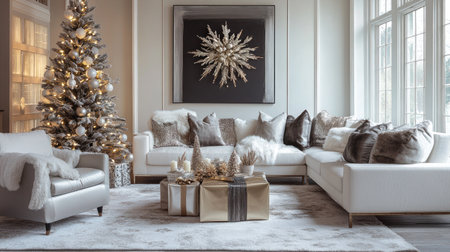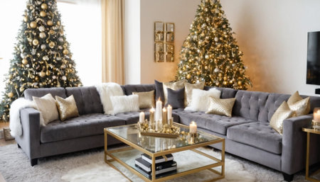 Stylish holiday living room with a modern Christmas tree, plush throws, and chic metallic decorations