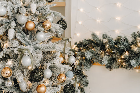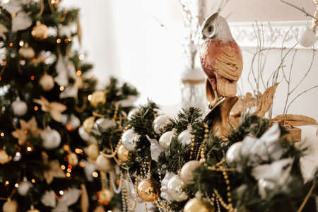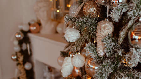 Decorated Christmas tree in the room. Coniferous tree with white and gild baubles located near the white wall during the celebration of the holiday