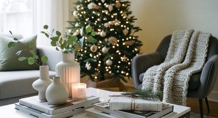 Modern Christmas living space. A cozy holiday corner with a stylish armchair, soft lighting, and a beautifully decorated tree. Perfect for modern holiday inspirations.