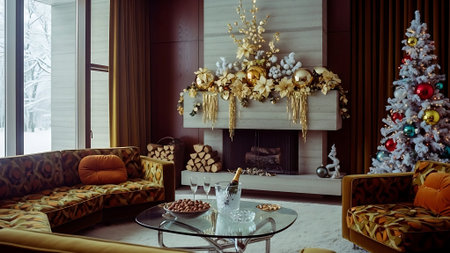 Living room interior with Christmas tree, holiday decorations and fireplace. Holidays concept