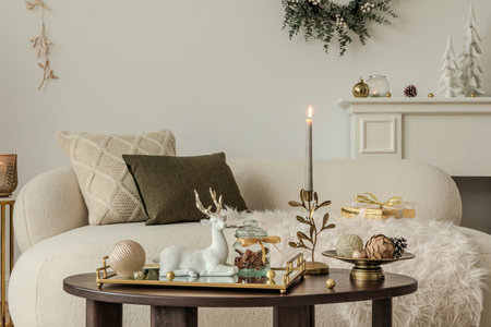 Cozy living room in Scandinavian style decorated with New Year decor. Photo
