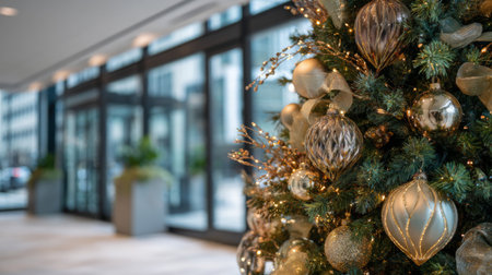 A beautifully decorated Christmas tree stands in a modern lobby, adorned with golden ornaments and twinkling lights, creating a warm holiday atmosphere.