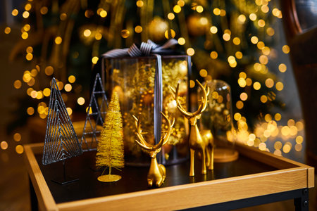 Christmas and New Year decorated living room with gifts, candles and fir tree