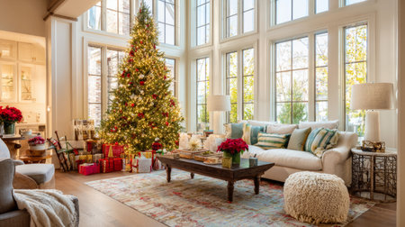 Elegant open living area, tall Christmas tree by large windows, festive decor, and colorful presents arranged for the New Year celebration