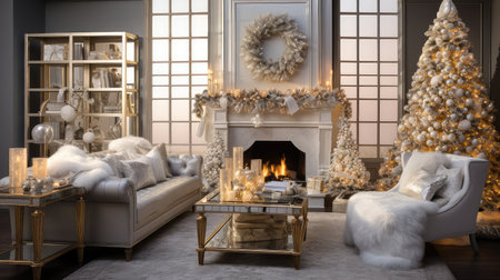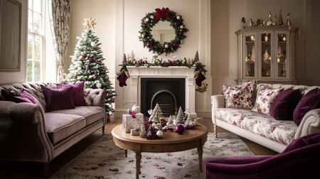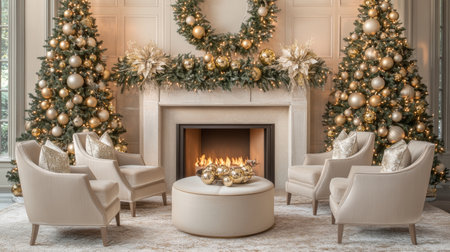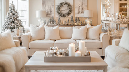 A beautifully decorated living room captures the essence of winter with festive warmth and elegance.