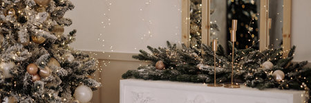 Banner decorated Christmas tree with evergreen garland in classic room with white wall