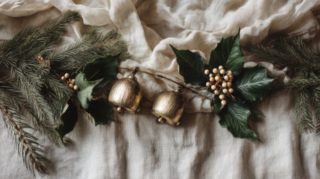A beautiful arrangement featuring golden bells amidst lush greenery and soft fabric, creating a warm and inviting atmosphere perfect for holiday celebrations.