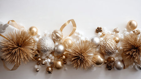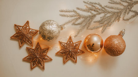This image showcases an elegant arrangement of golden Christmas ornaments and intricate stars with a sprig of silver foliage, perfect for holiday projects.