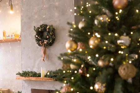 The interior of the Scandinavian-style living room, decorated for the Christmas holidays. Christmas tree next to the fireplace.