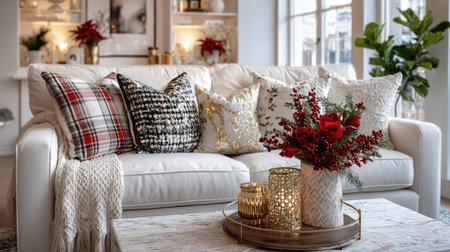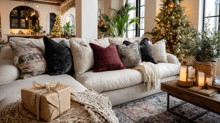 A beautifully decorated holiday living room featuring plush cushions, festive centerpieces, and an inviting atmosphere for seasonal gatherings.