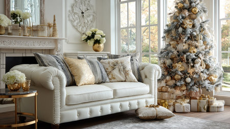 This image showcases a beautifully styled living room featuring a luxurious white sofa adorned with festive pillows, complemented by a stunning Christmas tree.