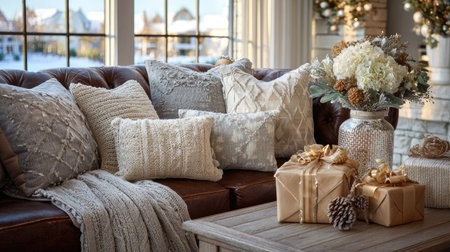 A cozy living room scene featuring plush decorative cushions on a rich brown sofa. Elegant floral arrangement and holiday gifts create a warm atmosphere.