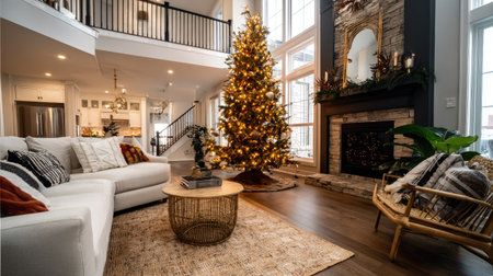 A beautiful living room featuring a well-decorated Christmas tree, modern furniture, and a cozy fireplace, perfect for holiday gatherings and celebrations.