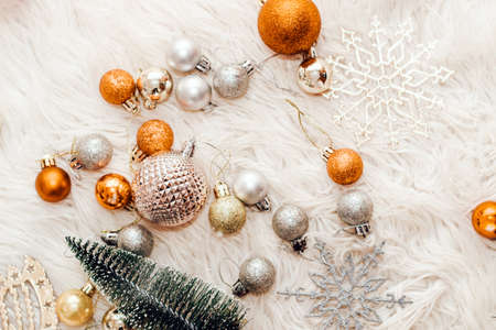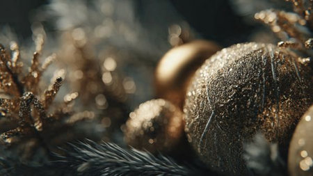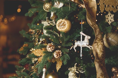 Christmas ornaments. Xmas tree decoration, golden color baubles closeup view, winter holiday festive background,