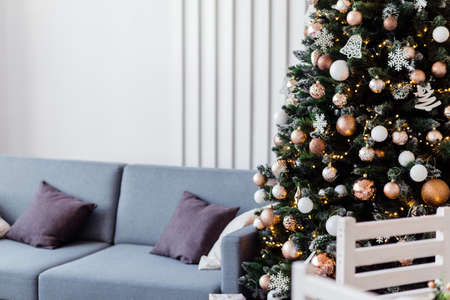 Christmas tree and living room with sofa and coffee table. Christmas and New Year concept