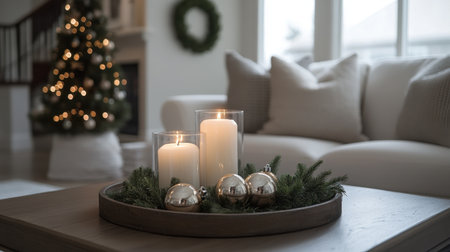 Coffee table centerpiece with candles, baubles, and evergreen sprigs in a cozy holiday setting