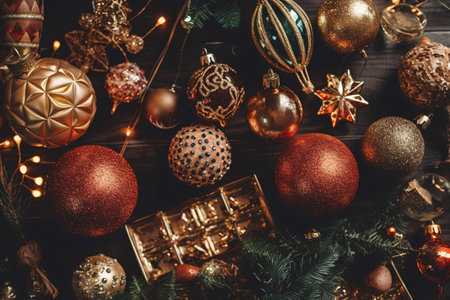 Christmas decoration on dark wooden background. Top view, flat lay.