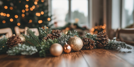 A holiday-themed flat lay featuring pinecones, ornaments, and festive greenery on a wooden table
