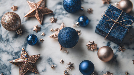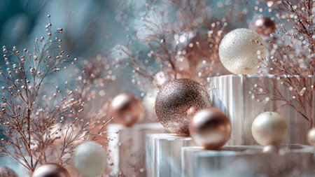 A premium Christmas mockup featuring monochrome blue textures and refined rose-gold ornaments.
