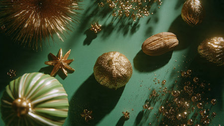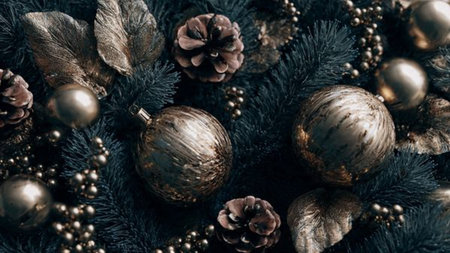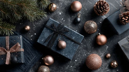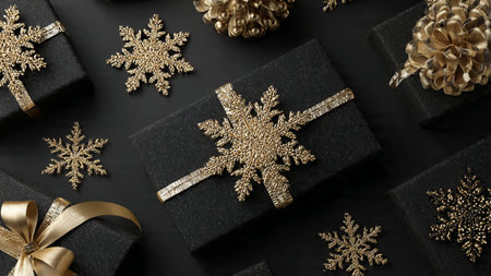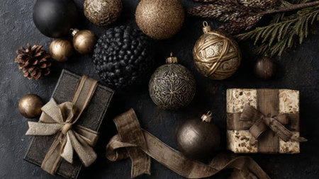 Ebony-black textures contrasted with radiant gold ornaments for a premium holiday look.