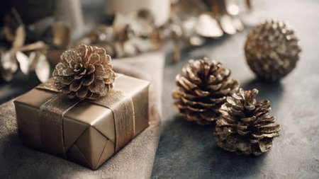 Elegant gold holiday decor with flowers and gifts in cozy rustic setting.