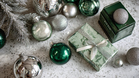 stylish christmas table centerpiece featuring silver ornaments a lit candle and white flowers. perfect for luxury winter interior design, holiday home staging, and festive celebration atmosphere.