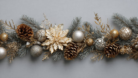 A warm Christmas border with lush pine clusters topped with mixed gold and silver decorations.