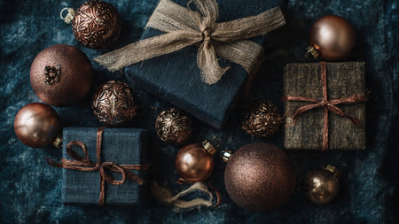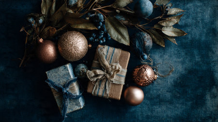 A moody vintage holiday composition with textured midnight-blue surfaces, antique rose-gold ornaments, and rustic ribboned presents.