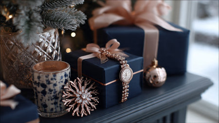 A cozy holiday scene featuring a decorated christmas tree, wrapped gifts, a cup of hot chocolate with whipped cream, and a vase with greenery on a wooden table