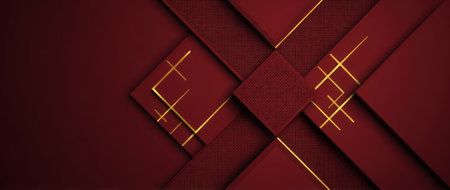 This abstract composition features a burgundy background with geometric shapes, overlaid by gold lines. The arrangement of squares and rectangles creates depth and dimension. Suitable for various applications, this design can be utilized for website backgrounds, marketing materials, or editorial content that requires a modern, elegant aesthetic.