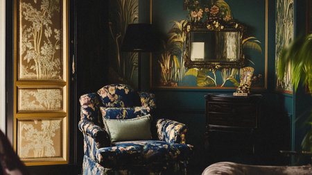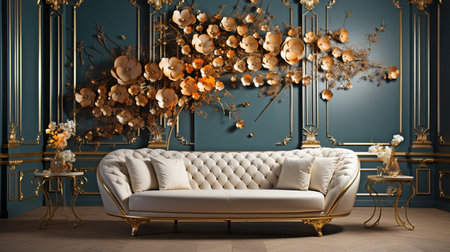 Luxurious floral themed lounge with ornate decor and elegant lighting. That the image is generated using AI.