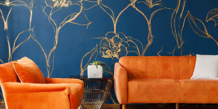 Living room interior with orange armchairs and vase with plant.