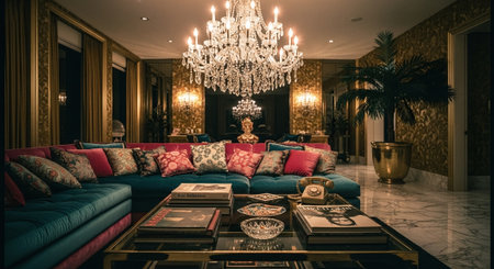 Living room decor, home interior design . Art Deco Glam style with Chandelier decorated with Velvet and Glass material . Generative AI AIG26.